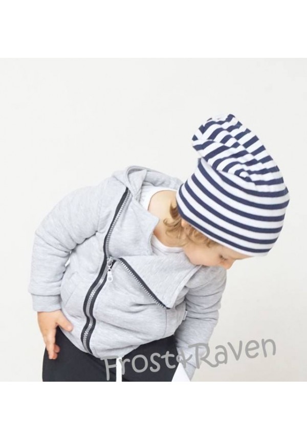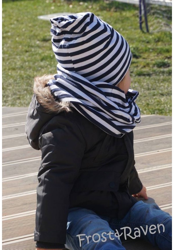 Dwuwarstwowa czapka smerfetka w zestawie z długim, kominem. Komin dwustronny, długi, zakładany na dwa razy. Paski: biały z granatem. Wykonane z polskiej dzianiny.